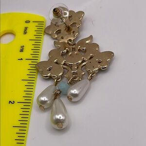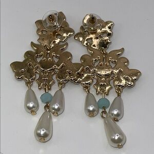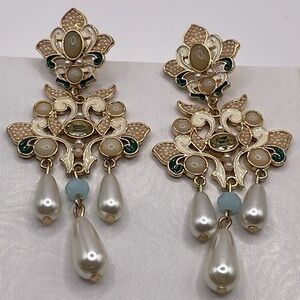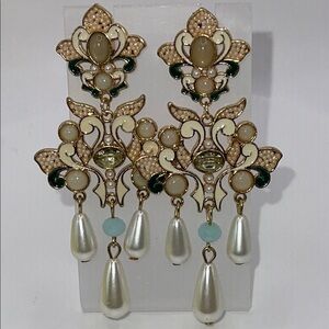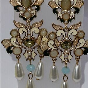 These stunning chandelier earrings feature intricate gold detailing with cream accents, perfect for adding a touch of elegance to any outfit. Excellent condition as shown.