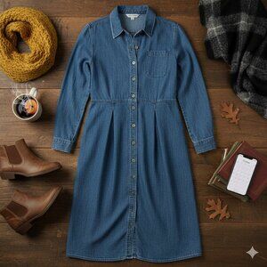 L.L. Bean long-sleeve midi dress in a classic medium-wash indigo denim. This timeless piece is crafted from 100% durable, high-quality cotton and features a full button-front closure with a traditional pointed collar. Designed with a flattering defined waistline and a pleated skirt, this versatile dress includes functional side pockets and a single chest pocket, making it a perfect blend of utility and vintage-inspired style for year-round wear.