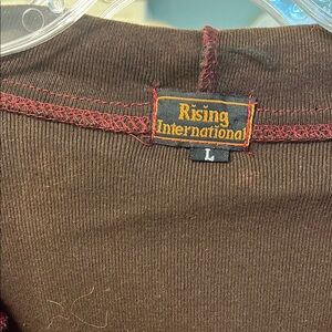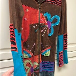 This Rising International hoodie jacket is a bohemian-inspired piece perfect for travel and casual occasions. Made of 100% cotton fabric, the long-sleeved hoodie features an embroidered floral pattern and accents, with a full zip closure and pockets for added convenience. The multicolor design is ideal for winter, fall, and spring seasons, and the garment care is machine washable. The size is large, and the fit is comfortable for women. Add this hippie-style hoodie to your activewear collection for a unique and fashionable look.
