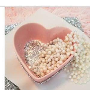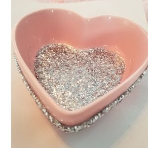 Pink Rhinestone jewelry trinket heart. Loaded up with bling and a glitter bottom. cute to store your jewelry You can use it in a nursery, put cotton balls in it, use it as a candy jar or just decor.😁 6x5.5"