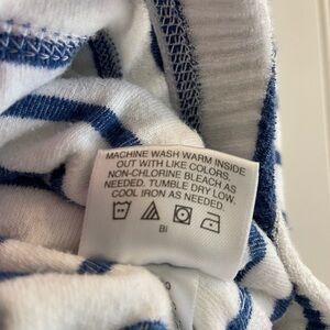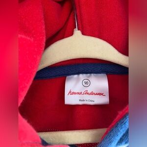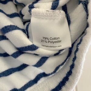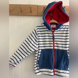 Hanna Andersson Terry Cloth Long Sleeve Zip Hoodie Swim Cover Up Beach 90 3T. Navy blue and white Terry cloth with red inside the hood. Full zip with pockets. Very good pre owned condition. No rips or stains. Ships from a non smoking home.