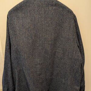 This is a Navy Herringbone Shetland Tweed Teba Jacket. A Teba was a traditional Spanish hunting jacket for the nobility of Spain in the early 20th century. This is made from 100% Shetland Tweed with a lining in the sleeves and shoulders. It has a 4-roll-3 button closure with faux leather buttons. There are working cuffs with a single button. There is a single internal chest pocket. There is one patch pocket on the breast and two flapped hip pockets. It was purchased new in Spain before the owners of Curzon Classics retired. It's sized as a European 58R, but fits like a US 46R. James Bond famously wore a navy Teba in the Film "A License to Kill".