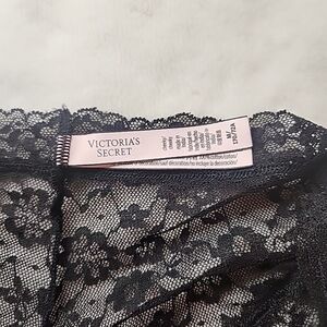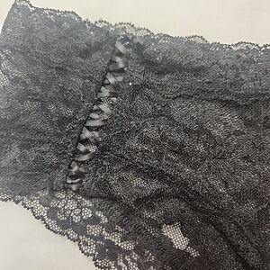 Spice up your lingerie collection with this Victoria's Secret Cheeky Panty in a beautiful black floral lace pattern. The strappy, lace-up sides with metallic silver details add a touch of glam to this low-rise panty, which is made of a polyamide blend fabric that stretches for a comfortable fit. The lace fabric is semi-transparent and gives a peek of skin, making it perfect for a romantic evening or a special occasion.