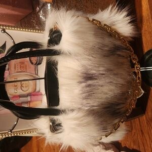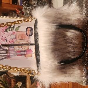 FAUX FUR WHITE AND BLACK SHOULDER BAG W GOLD CHAIN NWOT