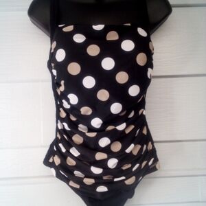 Polka Dots one piece swimsuit in black, white and brown. Very sexy with Tommy control and adjustable straps. Great for the beach or the pool.This is a sales price for the winter.I will be marking them back two original price when the weather gets warmer.No offers for less.