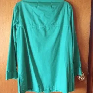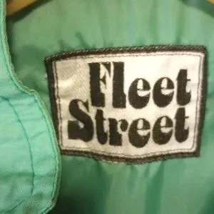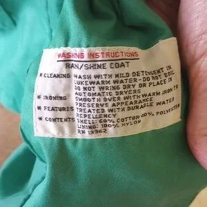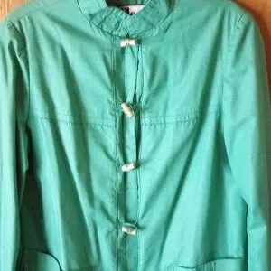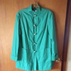 This Fleet Street jacket is Kelly green. It measures 18 inches from armpit to armpit and 31.5 inches long. Two pockets. Tan wood buttons. Has a lining. No size. Fits a small to medium woman. Good condition. Could be used for a raincoat.