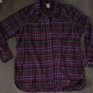 Stylish plaid button-up shirt with a classic design. Features a blend of purple and black colors.