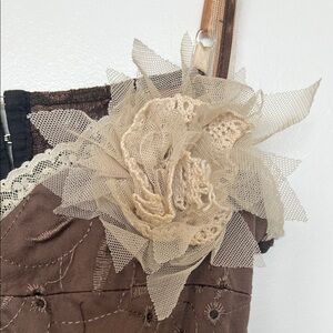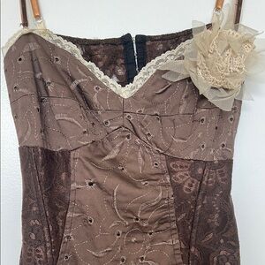 This elegant brown sheath dress by Rinascimento is perfect for a cocktail night out, featuring a flattering sweetheart neckline and delicate spaghetti straps. The fitted bodice and straight skirt create a sleek silhouette, while the shimmery fabric adds a touch of sophistication. Lots of great details including contrasting fabric and a crochet flower.