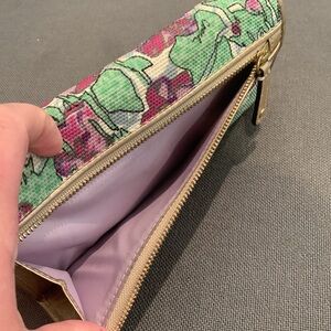 This Coach wallet showcases a stunning floral pattern in pink and gold, offering a chic and vibrant addition to your accessory collection. Its fold-over design ensures both style and functionality, making it a perfect choice for any occasion.