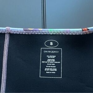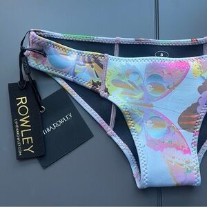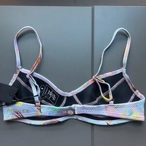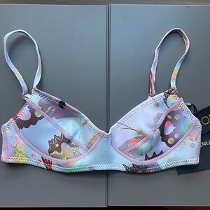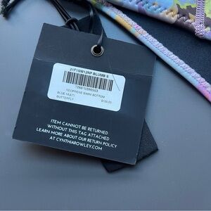 Blue butterfly bikini set by Cynthia Rowley. Colorful pastel blue pink lavender yellow butterfly design. .5 MM Fiber-Lite Neoprene. SPF 50+. Top: adjustable straps, no underwire, bustier retro design.