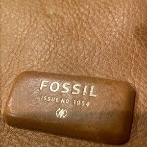 Stylish Fossil leather shoulder bag in Tan with Orange accents. Features a front pocket with a zipper. Used, some Scratch marks on front and back.