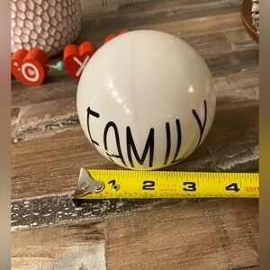 Round ceramic ball that says family in black writing. New