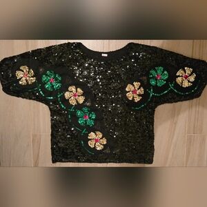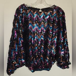 This sweater has 3/4 length sleeves and features turtles with little hats on their heads. There is some pilling under the arms and a spot on the front right side shown in pictures.