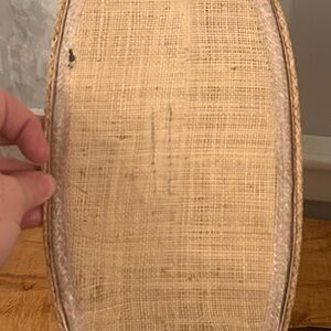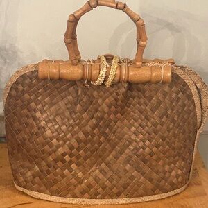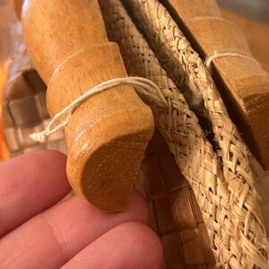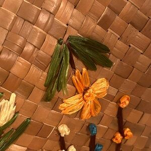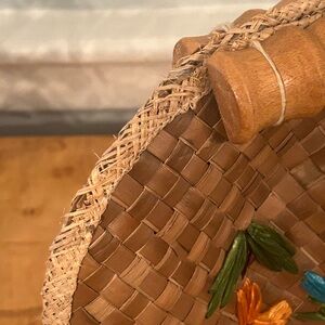 Bag is preowned and vintage. Therefore there are a few flaws. A piece of the straw on the green flower is sticking out. The string attaching the wooden handle to the bag is loose but does not affect functionality. Inside is clean. Please refer to pictures for accurate representation of condition. Bag is approximately 14.5 inches wide and 10 inches tall. Smoke free