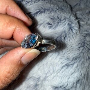 This stunning ring features a captivating blue gemstone set in a sleek (925) Sterling Silver band. Perfect for adding a touch of elegance to any outfit. The size is between 4 1/2-5 *I am unable of validating the exact size