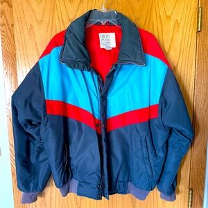 This jacket features a striking color-block design with deep navy, bright red, and vivid sky blue hues. Its water-resistant fabric make it perfect for casual outdoor activities, offering both style and functionality. Excellent condition!