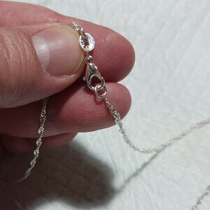 Chain is a twisted diamond cut curb chain that measures about 20 inches in length with lobster claw clasp closure