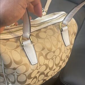 Stylish Coach tote with signature pattern. Features beige and cream colors. Perfect for everyday use. Has wear on the straps