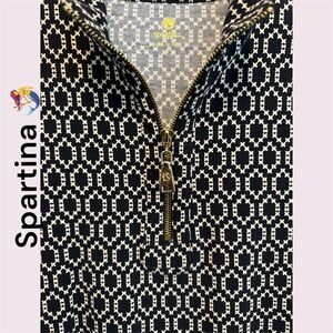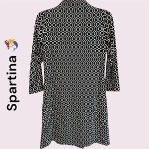 Elegant Spartina dress with a captivating black and cream pattern. 3/4 length sleeves. Signature stretch fabric. 35” shoulder to hem. 18” pit to pit. Perfect for any occasion.