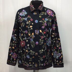 This Quacker Factory black jacket adorned with vibrant floral and butterfly beadwork, The collar and cuffs are trimmed with a bright turquoise this jacket combines elegance with a touch of whimsy.