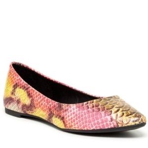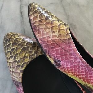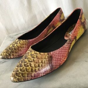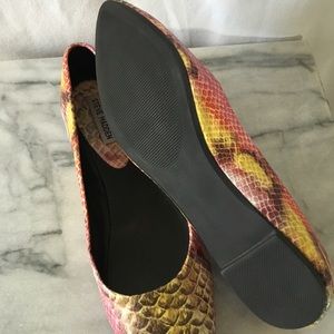 STEVE MADDEN CROCODILE SKIN FLAT. Excellent condition flats, just has an abrasion mark on the inner toe box of the right shoe (see last pic). Not so noticeable do to the busy print. Rest of shoe is in like new condition. The finish is patent- like. The yellow and pinks are accompanied by Browns, purples and some whites. Sz 8.5M. FIRM! Thanks! πππππ Irie