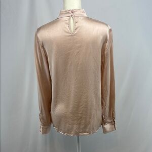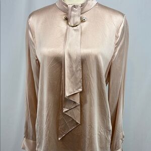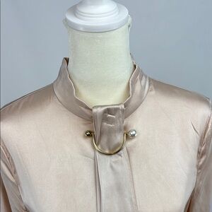 Absolutely stunning dusty pink silk blouse features long sleeves, back keyhole with button fasteners on a tab collar, and stylish front tie detail with gold and pearl clip. The soft, flowy fabric and generous cut make this a very comfortable piece while the sophisticated design makes it a must-have in your wardrobe.