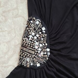 This stunning black one-shoulder top features eye-catching embellishments, perfect for a night out. Its sleek design offers a chic and sophisticated look.