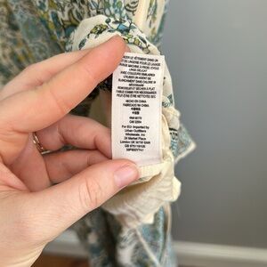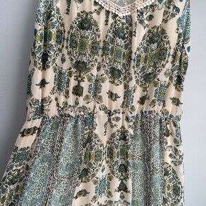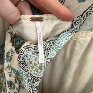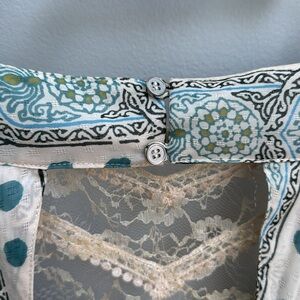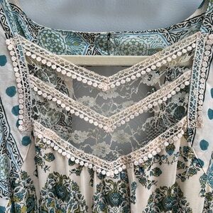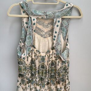 Free people maxi dress double front lace neckline. Double slit on front (one side has small tear in stitching, see photo). Cream green blue Moroccan boho print dress. Short slip lining. Sheer outer fabric. 2 button closure at neckline. Some signs of wear.