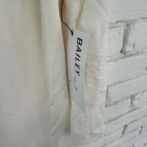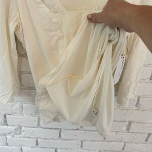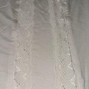Beautiful brand new and comfy against skin. 3/4 Sleeves. Sequins and lace design along the front. Nice creamy white color. See all photos and video. The lighting isn’t the best and tried to capture its beauty. I’d keep this as it’s gorgeous but too big for me. Rayon and Spandex