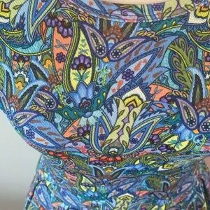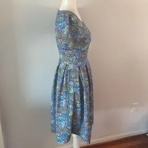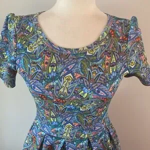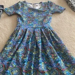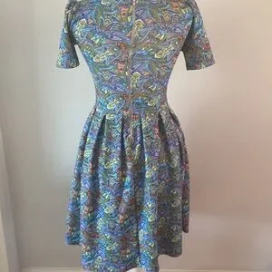 Super adorable multi colored fit and flare dress WITH POCKETS!! XS will fit a small too material is stretchy 37 inches long waist 13 inches lying flat and pit to pit is 15 inches lying flat. So cute on!!lularoe brand