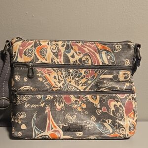 EUC stylish Kate Spade brown leather trim tote bag with a bold red stripe. Features a geometric pattern and tan handles.