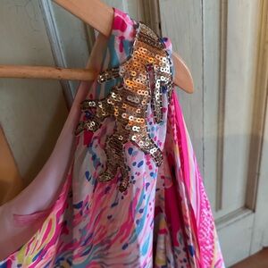 Stylish one-shoulder dress with a vibrant pink and multicolor pattern. Perfect for a bold look.