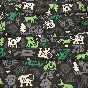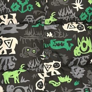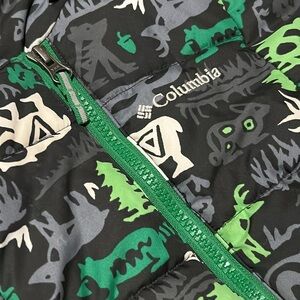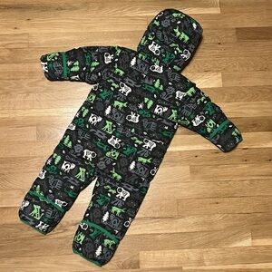 Adorable baby snowsuit with a hood. Features a playful pattern in black, green, and white.