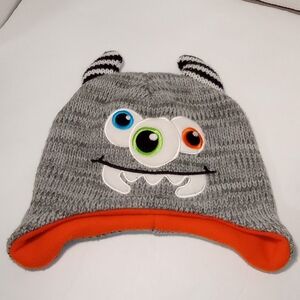 Fun gray, black , green, blue, white & orange knit beanie with monster face design. Features colorful eyes and striped horns.