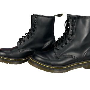 Stylish black leather boots with distinctive yellow stitching. Durable and versatile. Like new. Literally worn once.