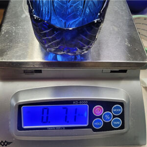 This is a pre-owned Upper Canada Soap & Candle Makers glass vase, made in Spain from recycled glass. It features a deep blue hue and a textured leaf pattern. The vase measures approximately 2 inches in height. The base has a sticker with the brand information. The item weighs 7.1 oz. There are no visible chips or cracks.