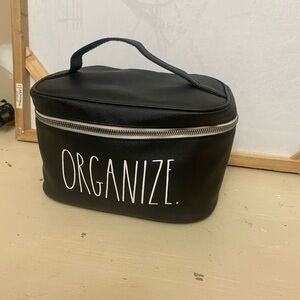 This Rae Dunn cosmetic bag in sleek black is perfect for organizing your beauty essentials. Featuring a convenient handle and a secure zipper closure, it combines style with functionality. Its compact design makes it ideal for travel or everyday use.