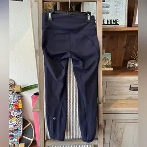EUC Lululemon women’s extra mile crop size 4. These crops are in like new condition! Midnight navy color, reflective dots down sides, one side zipper pocket. Open pocket on back waistband and inner elastic tie for custom fit! Check photos for measurements in inches!