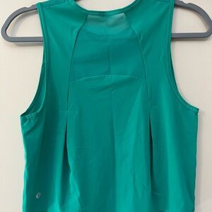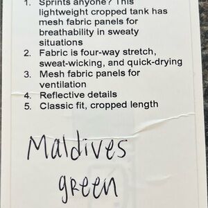 Lululemon Sculpt Cropped Tank in Maldives Green color. Lightweight cropped tank with mesh fabric panels for breathability. Fabric is four-way stretch, sweat-wicking, and quick-drying. Classic fit, cropped length.