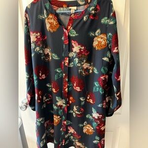 Cutout at Midsection with 3 buttons and beautiful flutter sleeves. Perfect for the Holidays. Semi sheer.
