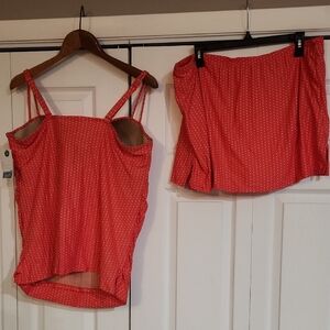 Brand new with tags Swim by Cacique Swimsuit. This 2 pc. lined tank top and skirt set is an orange color with white polka dots. The top is size 44DD and has underwire for support. The bottom skirt is size 20.