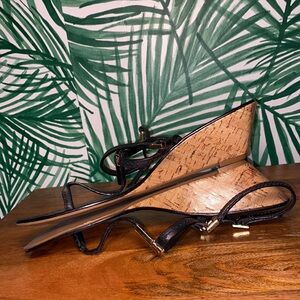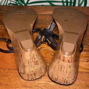 Tory Burch Pauline Black Leather Strappy Wedge Sandals. Women’s 8.5 M. Buckled Strap. 2” Cork Wedge. Gold Brass Hardware. Clean. Great Condition. Please See Photos. Questions Welcome.
