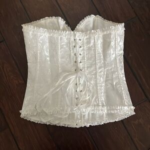 Beautiful white corset top with intricate detailing. Features a ribbon tie and button closures.