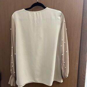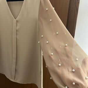 This elegant cream blouse features delicate sheer sleeves adorned with pearl accents, perfect for adding a touch of sophistication to any outfit.
