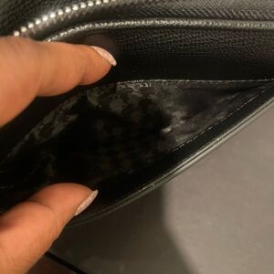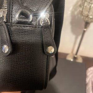 This Karl Lagerfeld crossbody bag showcases a striking black leather design adorned with vibrant red heart embellishments. The structured, rectangular shape and adjustable strap make it a versatile accessory for any occasion. Elevate your style with this playful yet sophisticated piece. Final sale.