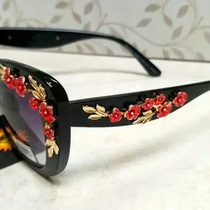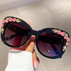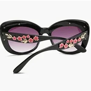 New! Vintage-Style Sunglasses with Sculpted Floral Detail - Black