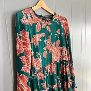 Keywords: MaEve, Anthropologie, Floral dress, Tiered dress, Long sleeve dress, Bohemian dress, Casual dress, Midi dress, Women's fashion, Green dress, Orange floral, Ruffled neckline, Button closure, Medium size, Boho chic, anthro dress