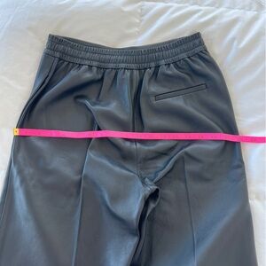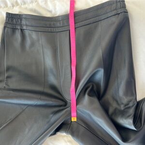 In good condition, leather pants. It’s like sweat pants made in leather. Here are the measurements. Waist is elastic 26 1/2” rise 11 1/2” hips 36” inseam 28 3/4” leg opening 21”. Slight marks.