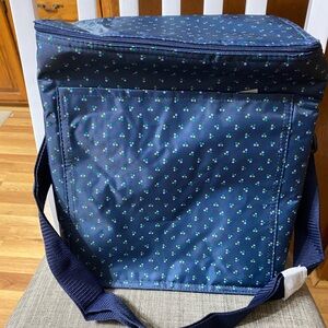 Stylish blue poka dot Picnic thermal tote with new leak thermal lining allows for ice. Has zip around closure and detachable adjustable strap with exterior pocket. Approximate measurement 13H X 11L X 6D. All sales final. No cancellations