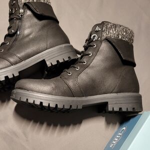 Trendy black ankle boots with lace-up design. Features a cozy knit detail.